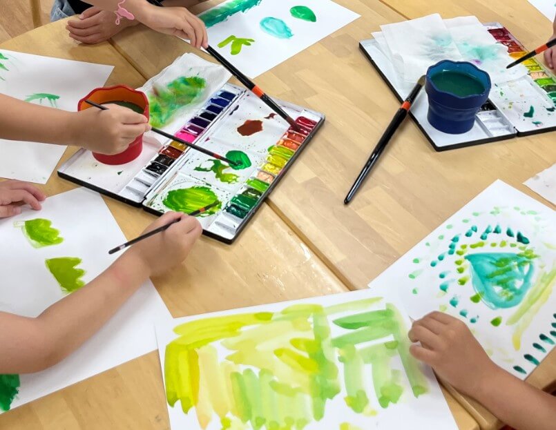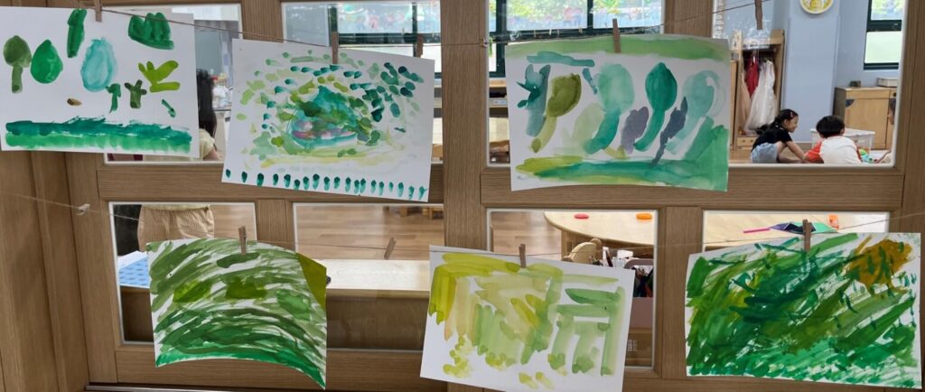 아이들은 자신이 만든 초록색으로 그림을 그렸다.