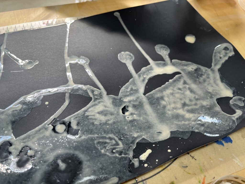 흙물감을 붓고, 그 위에 다른 색을 흘리며